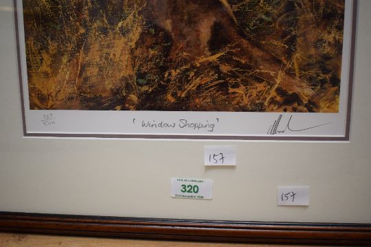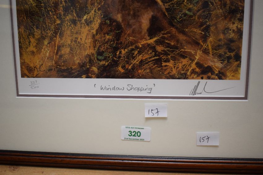 After Mick Cowston (British 1959-2006) limited edition colour print 'Window Shopping' rural fox stalking pheasants, signed, entitled and numbered 327/500 in pencil to margin, within a stepped card mount and moulded frame, under glass 40cm x 27cm & 57cm x 38cm overall.