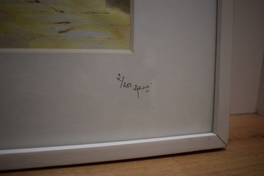 Pair of contemporary Indian prints, the first a street scene with bikes, the second the roof of a temple, both signed indistinctively to lower right and numbered 2/200, within card mounts and flat white frames, under glass 54cm x 36cm & 73cm 54cm overall.
