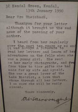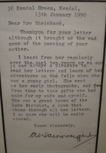 *Local Interest* Alfred Wainwright (British 1907 - 1991) a typed letter from Wainwright to Mrs Rheinbach expressing his sadness for the passing of her mother and fondness towards the correspondence he had shared with her over the years on an Animal Rescue Cumbria charity card depicting a print of a Wainwright sketch of the Langdale Pikes verso, signed in pen and dated (13th January 1990), within card mount and thin black double sided frame showcasing both sides of the card, under glass 8cm x 16.5cm & 19cm x 38cm overall. *Animal Rescue Cumbria, also known as the Wainwright shelter was established in 1972 by Wainwright himself.