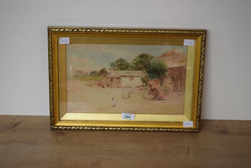 *Local Interest* Cuthbert Rigby (British 1850 - 1935) Watercolour, depicting chickens in a farm yard, signed and dated (1898) lower left, faded attribution verso, within gilt slip and moulded gilt frame, under glass 31cm x 18.5cm & 40.5cm x 27.5cm overall. Glass in frame is broken.