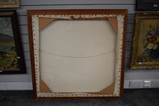 Eric Scott (British 1945 - 2005) Oil on canvas 'Question', depicting figures from different time periods against a stormy moorland landscape, signed lower left, attributed and entitled verso, within flat wooden frame, 91.5cm x 88.5cm & 103 x 100.5cm overall.