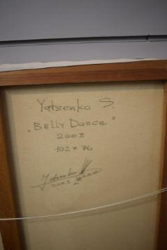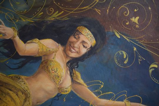 Sergi Yatsenko (UAE Contemporary) Oil on canvas 'Belly Dance', an accomplished depiction of a female belly dancer with gold coloured spiral embellishment capturing the movement of dance, signed and dated (2003) lower right, counter signed titled and dated verso, 101.5cm x 76cm overall.