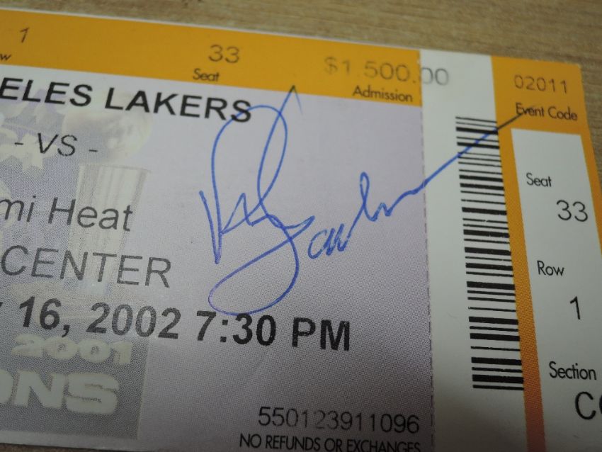 2002 Los Aneles Lakers Vs Miami Heat Ticket Seat 33 Row 1, ticket price $1500, bearing signature in pen, Jackson?