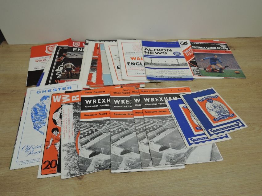 1950's and later Football Programmes, 1953-54 Liverpool V Huddersfield T, 1955 Wales V England, 1958 Wales V Scotland, 1964 Liverpool V Manchester United, 1965 Wales V England, 1965 West Bromwich Albion V Sunderland, 1965 Portsmouth V Preston North End, 1965 Portsmouth V Crystal Palace, 1966 Liverpool V Manchester United, 1967 Liverpool V Newcastle Utd, 1967 Wrexham V Brentford, 1968 Wales V Ireland, 1968 Under 23 International Wales V England x2, 1968 FA Cup 6th Rd 2nd Replay West Bromwich Albion V Liverpool, 1968 Wrexham V Chesterfield, 1968 Wrexham V Exeter City, 1968 Wrexham V York City, 1968 Wrexham V Blackpool, 1970 Wales V England, 1970 Under 23 International Wales V England with ticket stub, 1976 Wales V England, 1967 Queen's Park FC Centenary Celtic V Tottenham Hotspur, 1978 Wrexham V Preston North End, 1979 Wrexham V Preston North End, 1976 European Cup Winners Cup Wrexham V Anderlecht, 1978-79 Swansea V Mansfield Town and 1968-69 Chester V Chesterfield along with Football League Review x4 (32)