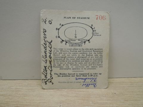 1929 FA Cup Final Ticket, 27th April, Entrance 12, East Standing Enclosure, Bolton Wanderers V Portsmouth, teams and scorers to reverse, slight foxing to front