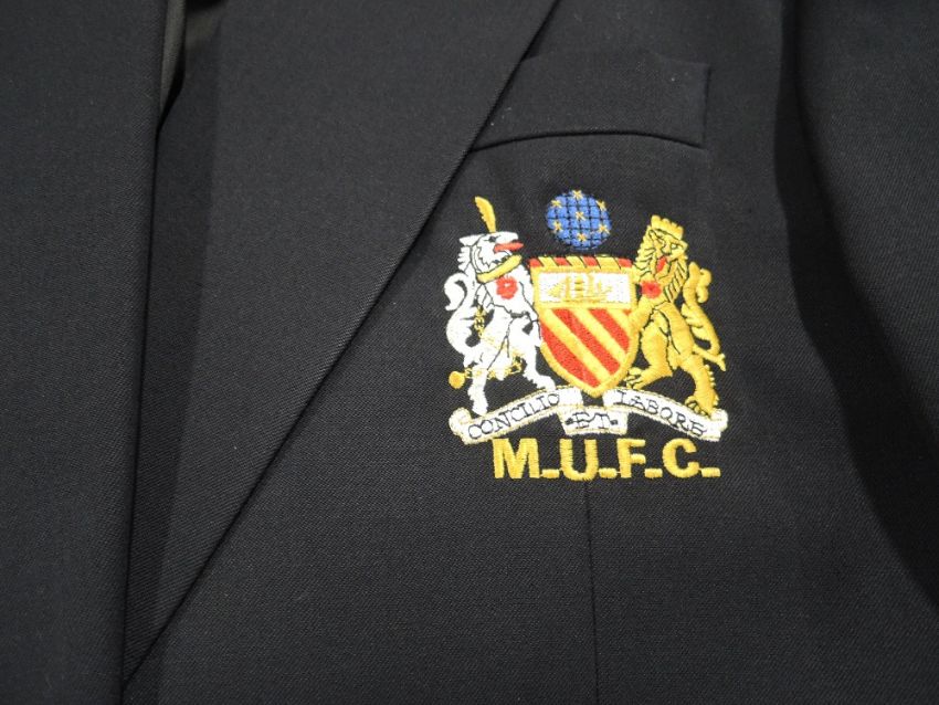 Manchester United FC 1990's Blazer having traditional Crest to breast pocket M.U.F.C with lions, shield and globe above, made by Roy Robson, along with a pair of M&S black trousers size waist 38in, inside leg 31in, belonging to Michael Wheeton, Managing Director of the Catering Limited at the time, size not stated, small/medium fit, possibly worn during most major finals at the time including 1999 Champions League