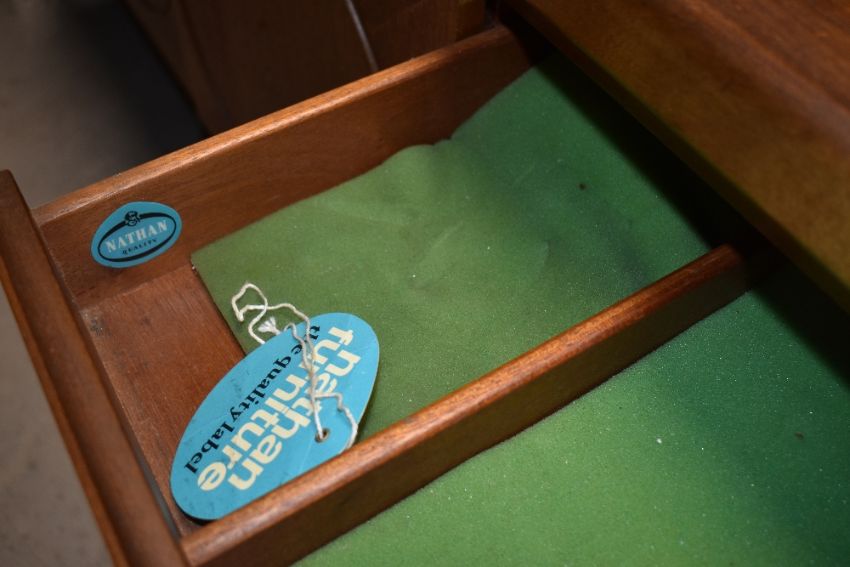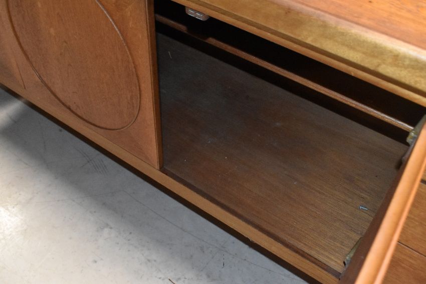 A vintage teak sideboard, Nathan 'circles' design, drop flap cocktail section to left, width central double cupboard and three drawers to right hand side, width approx. 183cm, depth 45cm, height 79cm