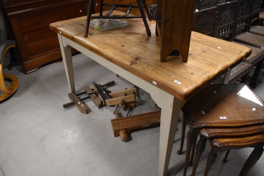 A traditional pine kitchen table having rustic top on painted frame, made by well reputed Maine company Harrogate approx. 152 x 76cm