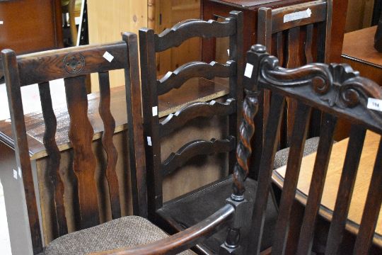 A selection of various early 20th Century dining chairs including wave back pair, twist frame carver and later ladderback