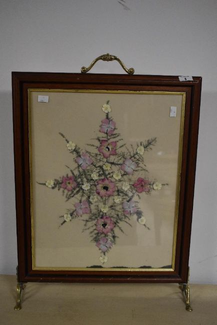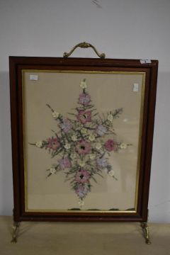 A modern fire screen with foliate decoupage decoration, having Art Nouveau style brass feet