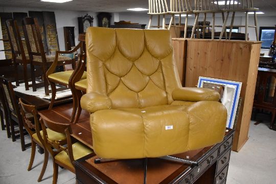 A vintage mustard/ochre vinyl or leather armchair on chrome swivel frame