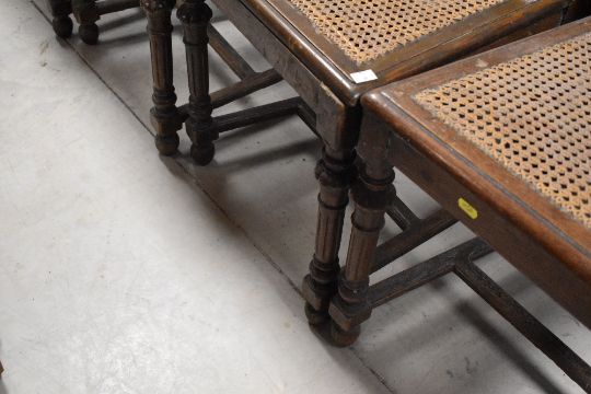 A set of eight 19th Century cane seated bedroom chairs having interesting embossed leather backs , lion decoration and lion studs