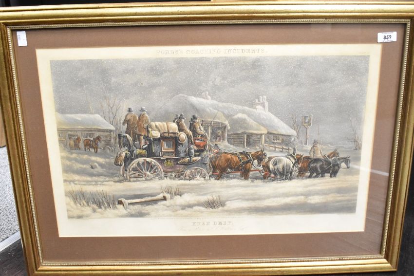 A large framed print entitled Fores's Coaching Incidents Plate 1, Knee Deep From a Picture by CC Henderson Esq, mounted framed and glazed 80cm x 56cm.