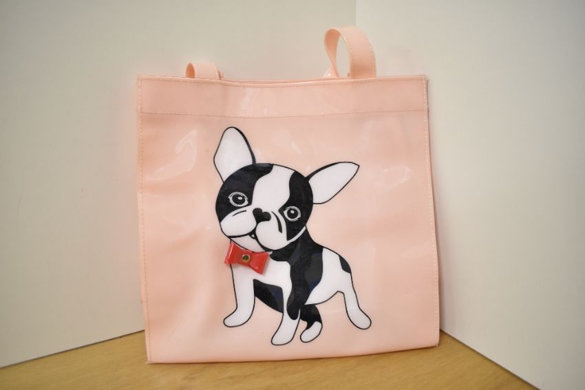 Three y2k shopping totes, including a 2000s Ted Baker example, another Ted Baker, black with gold cat motif and ears cut into the shape, along with a baby pink mini-tote with dog motif and 3D red bow detail.