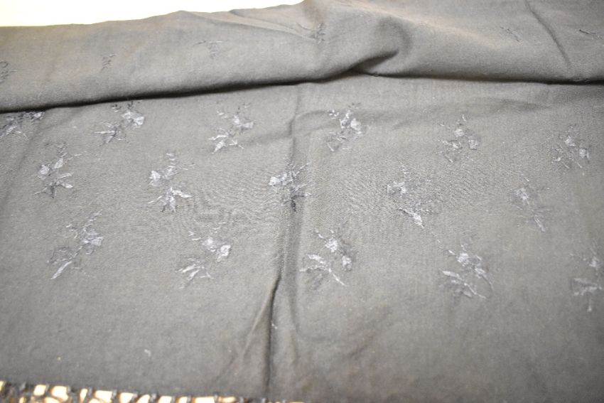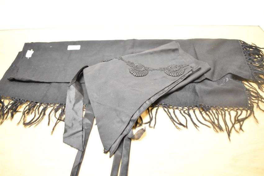 Two pieces of Victorian / Edwardian mourning wear, to include a silk half-apron with pointed hem, with circular flower embroidery and silk backing, lovely condition though some subtle marks to frontage, along with a fine wool shawl in black with all over hand embroidered floral pattern, tasselled edge, small moth hole centre right