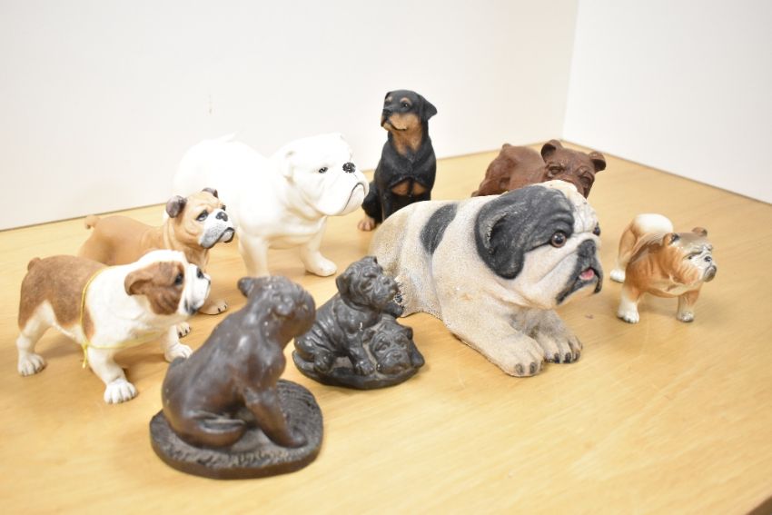 A group of nine amateur dog studies to include a large Coopercraft pottery Bulldog etc.