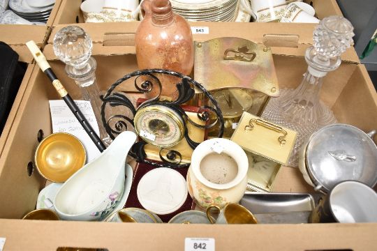 Two cut glass ships decanters, a Channel Islands part tea service in green glaze with gilt inner and edges comprising six cup and saucers and a matching sugar bowl, a Crown Ducal vase, a Carlton Ware 'Morning Glory' gravy boat and matching saucer, a Guinness penny whistle and two brass effect clocks etc.