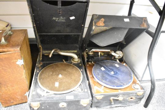 A vintage Columbia Viva Tonal Grafonola box gramophone in need of restoration and a similar May Fair box gramophone in similar condition sold with an oak cased Vi-Tan sun lamp by The Thermal Syndicate Wallsend.