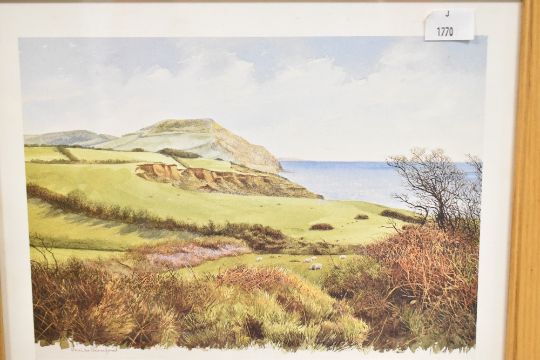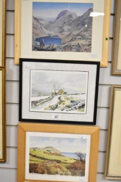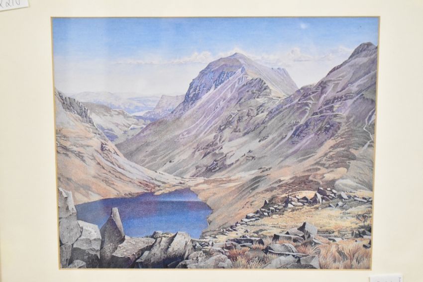 After Burrows, British contemporary scene of Grisdale tarn with a view of St Sunday Crag from Seat Sandal, within card mount and moulded wooden frame sold alongside a lithograph of a snowy farm house and a second of a pastoral coastal scene.