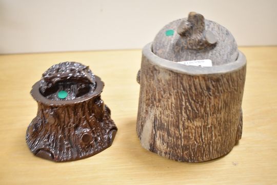 Two late 20th-century tobacco jars, both featuring a log finial and tree stump textured design, both with an earthy, natural finish (2 items).