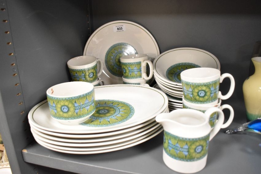A 1970's ceramic part dinner/tea service having a distinctive green, brown and blue geometric pattern to a light cream back ground, comprising twenty seven pieces approximately.