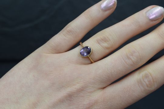 A 9ct gold amethyst ring having an oval stone in a collared mount to knife blade shoulders on a yellow metal loop stamped 9ct, size M & 1.9g