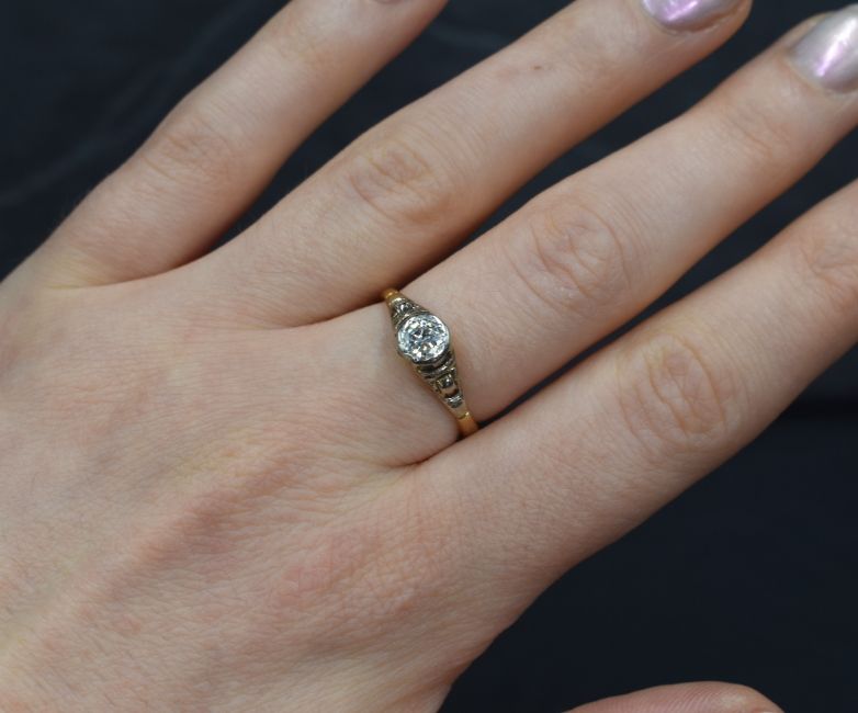 A yellow metal diamond solitaire ring having a 0.25ct stone in a collared mount to raised moulded shoulders and yellow metal loop, no marks but presumed 18ct gold, size M & approx 2.6g