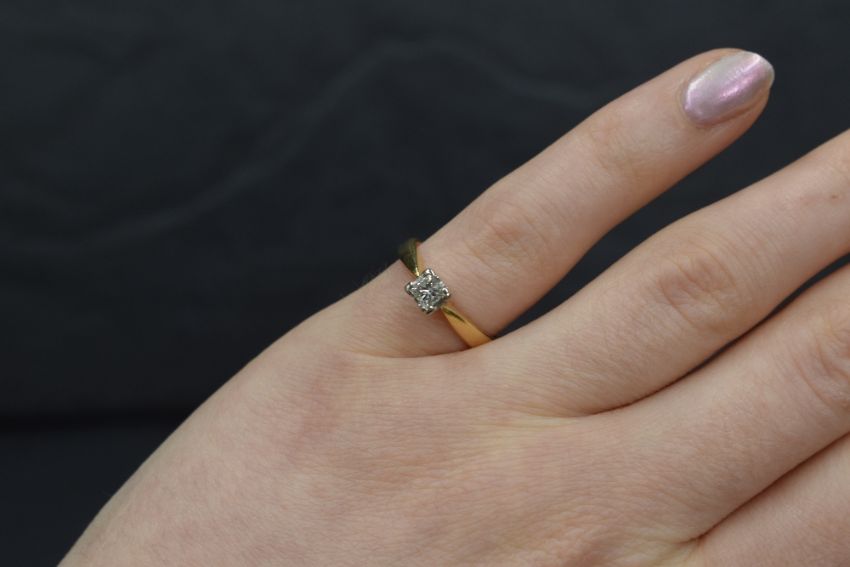 An 18ct gold diamond set solitaire ring, the princess cut diamond measuring approximately 0.24ct, in a four claw setting having pierced hearts to the gallery, marked 750, ring size I-J, 2.5g