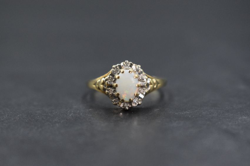A 9ct gold opal and diamond cluster ring having a central oval opal cabochon within an illusion set diamond chip surround to decorative shoulders on a 9ct gold loop, size P & 2g