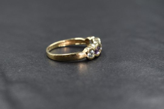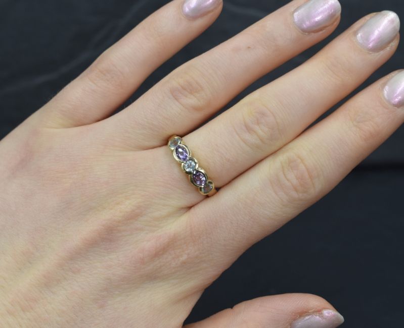 A 9ct gold amethyst and topaz set band, the three round cut pale blue topaz alternating with two marquise cut amethyst, in bezel settings, marked 375, ring size M, 2.3g