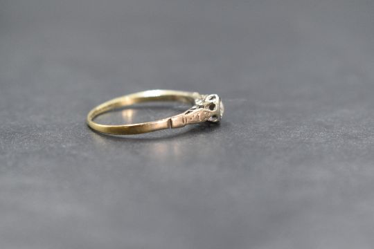 An 18ct gold diamond solitaire ring the small illusion set diamond within high moulded shoulders on an 18ct gold loop, size O/P & 1.7g, ring very worn