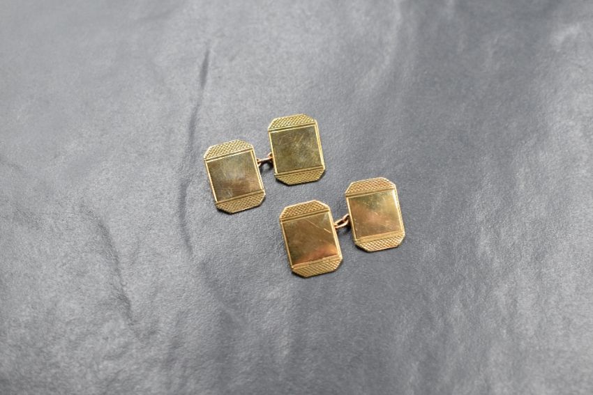 A cased pair of 9ct gold cufflinks having canted rectangular panels with cut decoration and chain connectors, approx 3g