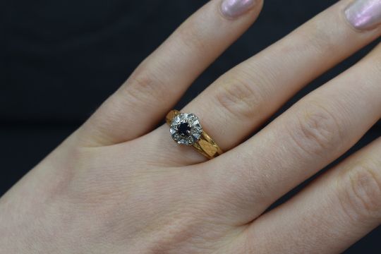An 18ct gold sapphire and diamond chip cluster ring having a small central sapphire within a diamond chip set illusionary mount to brightcut shoulders on an 18ct gold loop, size M & 3.5g