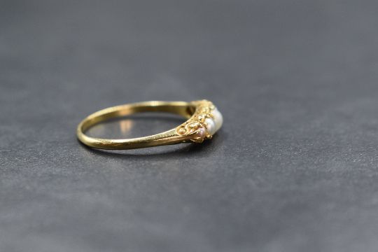 An 18ct gold seed pearl ring having five graduated small split seed pearls in a gallery mount on a yellow metal loop stamped 18ct, size Q & 2.4g