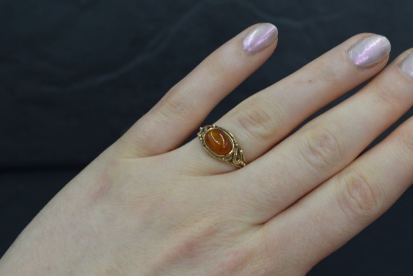 A 9ct gold amber set ring, the oval amber cabochon in a bezel setting, having decorative pierced line and beadwork to the shoulders, marked 375, ring size L, 2g