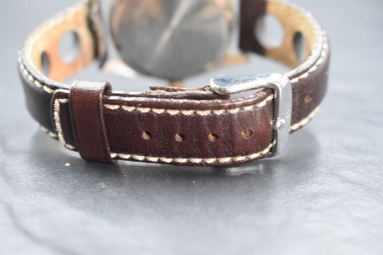 A vintage Rotary Incabloc 24 hour dial wristwatch, the champagne dial having baton and Arabic numerals from 13 to 24, on a brown leather strap with punctured decoration, in a Rotary box