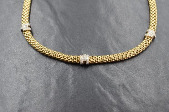 An 18ct gold diamond set Fope Gioielli necklace, the woven gold chain having three diamond set white gold panels, each set with twelve 1mm brilliant cut diamonds, with a lobster clasp, 43cm, marked Fope 750, 40g. In original box with documents and insurance valuation dated September 2025 of £15,000