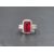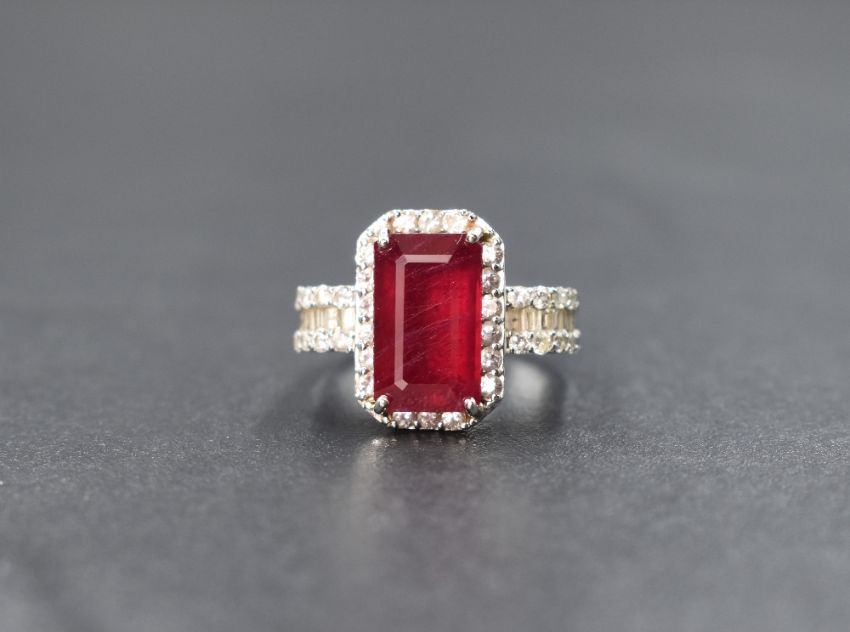 An 18ct white gold ruby and diamond set cluster ring, the central emerald cut ruby measuring approximately 11mm x 6mm x 3mm in an eighteen round brilliant cut diamond surround, having six baguette cut diamonds and ten round brilliant cut diamonds to each squared shoulder, marked 750, ring size M, 6.5g. Ruby loose in setting with various inclusions