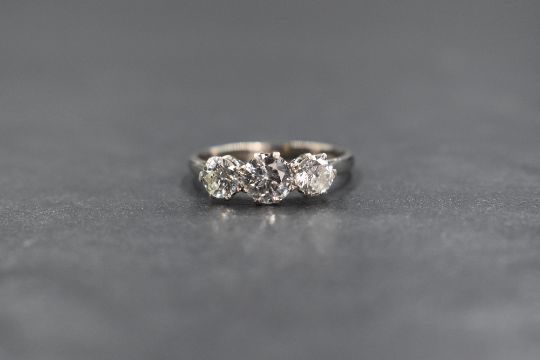 An 18ct white gold and platinum three stone diamond set ring, the graduated round brilliant cut diamonds measuring approximately 1.16ct total, marked 18ct Plat. ring size O-P, 3.2g. Good brilliance and some fire to diamonds, eye clean with some inclusions under magnification