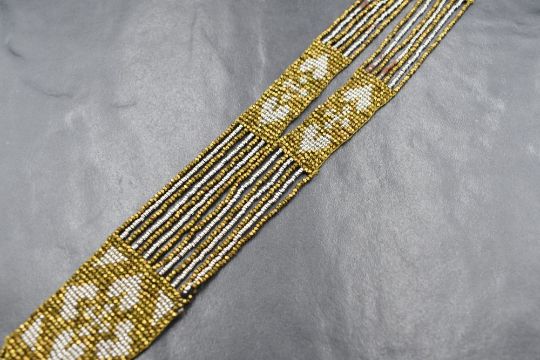 A belle epoque beaded sautoir necklace having gold and silver coloured metal beaded strands linking beaded panels with heart decoration and terminating with a beaded tassel, approx 40' and approx 62g