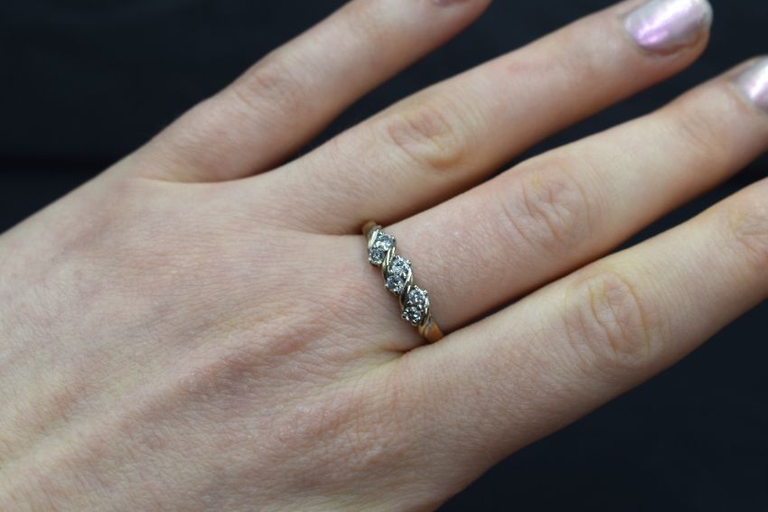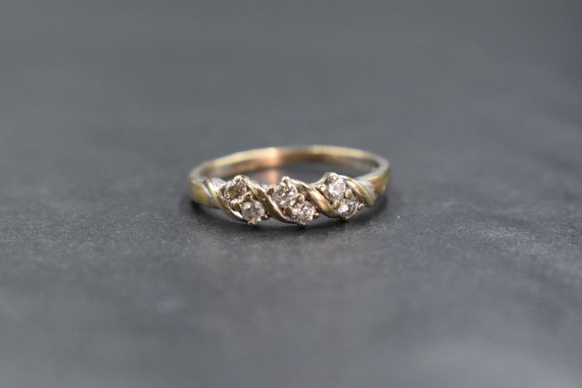 A 9ct gold diamond set band, the six round brilliant cut diamonds measuring approximately 0.04ct each, in a twist motif design, marked 375, ring size Q-R, 2.2g