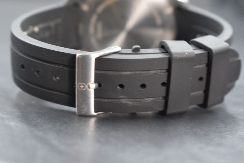 A gent's Victorinox Swiss Army quartz wrist watch, model no:241357 having an Arabic numeral dial with inner 24hr dial on a black face in a steel case no:090965884 on a black rubber strap, with warranty card, case and box