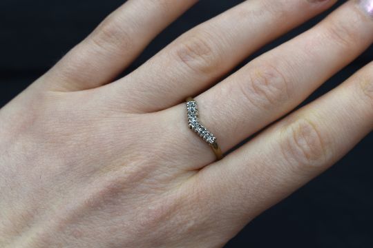 A 9ct gold cubic zirconia set wishbone ring, the seven round cut cubic zirconia in a wishbone setting, marked 375, ring size O-P, 1.1g