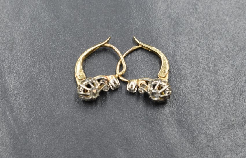 A pair of yellow metal presumed gold diamond set drop earrings, having three graduated rose cut diamonds in bezel and claw settings, on hoop backs, rubbed marks, 3.8g gross