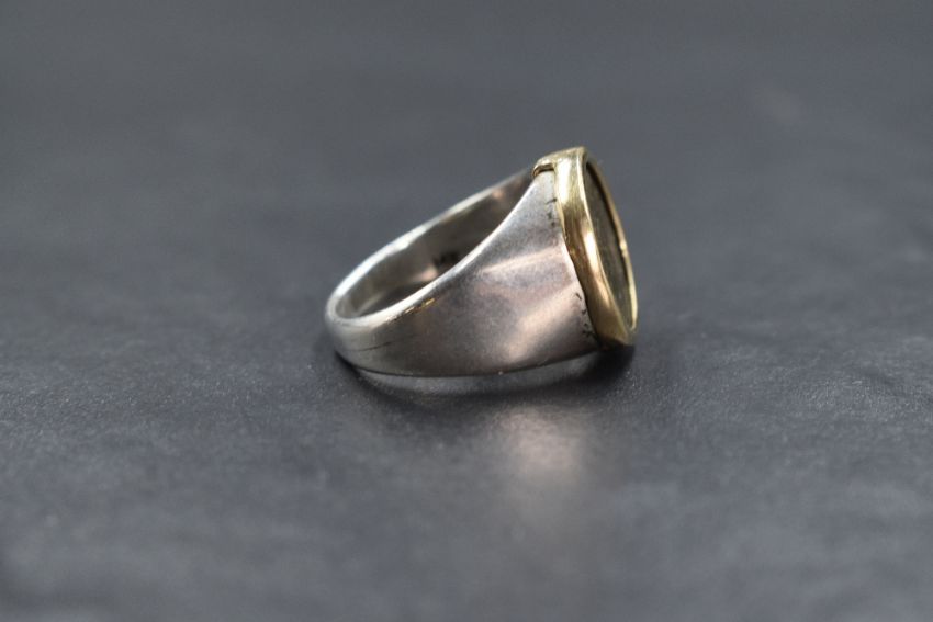 A silver and 14ct gold coin set signet ring, the imitation Roman coin in a yellow gold bezel setting on a silver shank, marked 14K and 925, ring size Q-R, 8.8g