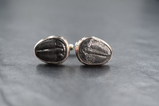 Three pairs of modern silver cufflinks, each having inset fossil decoration, including Trilobites, Ammonites and possibly dinosaur bone, possibly retailed by Hepburn & Hughes jewellers of Derbyshire