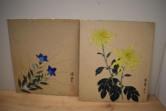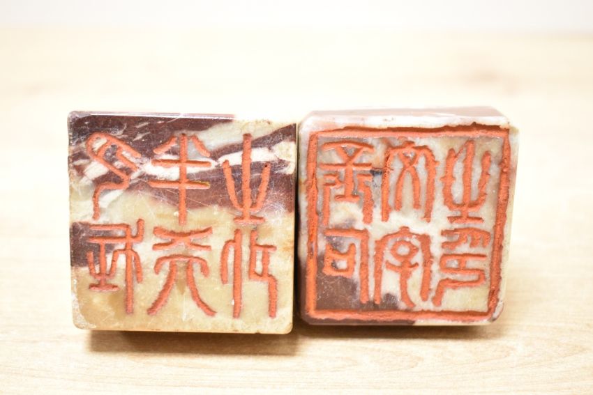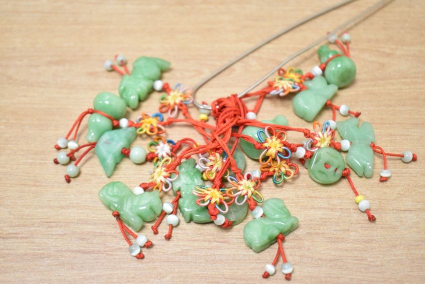 A quantity of 20th-century oriental sundry pieces, to include a selection of Chinese red cord knot charms featuring carved green hardstone zodiac pendants and a small bangle; two Chinese carved stone turtle seals; two woodblock-style floral prints; and two framed cork-carved rural scenes, (approximately 20), condition is consistent with age and use.