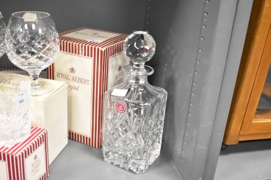 A quantity of 20th-century crystal cut glassware, to include a Royal Albert decanter and four tumblers; two small Royal Doulton crystal goblets; a selection of Tutbury Crystal tumblers and two Edinburgh Crystal Tumblers, most marked or with sticker, (9 tumblers, 2 goblets and 1 decanter), condition is consistent with age and use, most come with original boxes and have original stickers too.