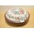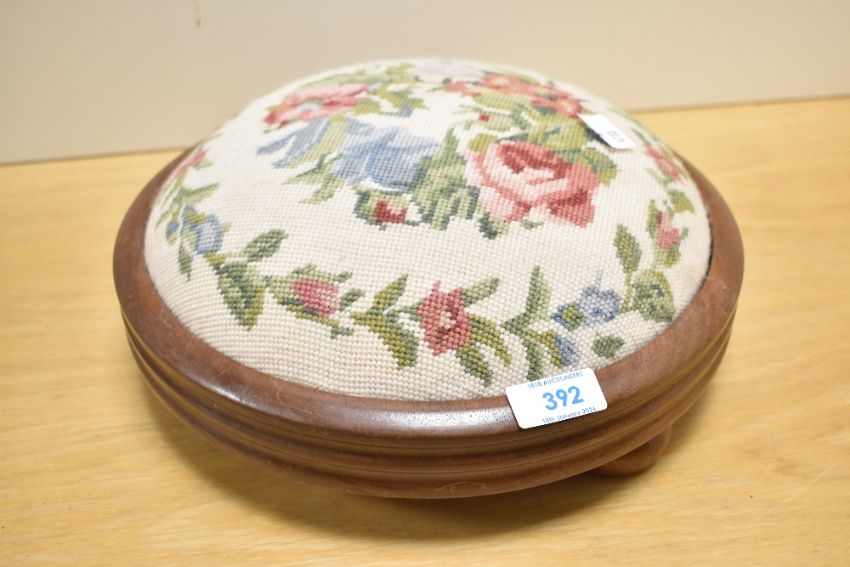 A contemporary mahogany and needlepoint footstool, having soft pink rose and foliage decoration, upon three ball-formed legs, 29cm diameter, good condition.