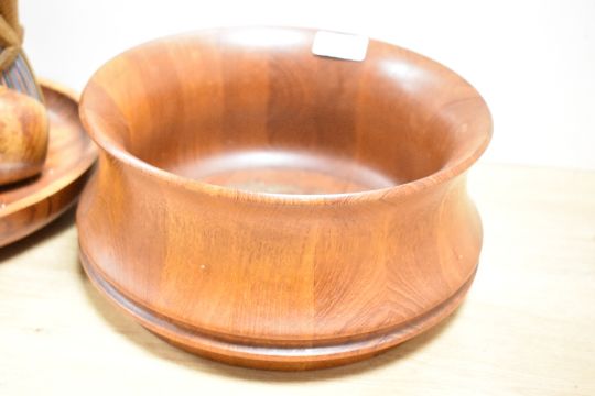 A selection of mixed 20th-century woodwork, to include: a pair of German Black Forest-style Folk Art decorative figures depicting a male farmer and an elderly female in traditional Alpine clothing; an Indian Syed Murtagh hand-painted box with ornate floral and foliate decoration; three hand-carved wooden fruit ornaments (two apples and a pear); a Danish Scanform hand-turned fruit bowl; and more, (9).